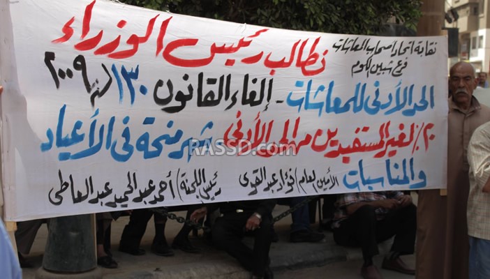“خدوا المناصب والمكاسب وأعطونا الطعام”، شعار يرفعه أصحاب المعاشات الذين قاموا بتنظيم أكثر من وقفة احتجاجية للمطالبة بالحد الأدنى للأجور طبقًا للمادة 17 من الدستور، والفروق المالية للعاملين الذين أضيروا أثناء خروجهم على المعاش المبكر من القطاع الخاص، وفرق علاوة 2007 و2008 ، وتحسين الرعاية الصحية ومجانية المواصلات، ووضع المليارات الخاصة بأصحاب المعاشات فى بنك لتصرف على مشروعات صغيرة للشباب، مما يعود بالخير على الجميع، بحسب ما اقترحه النقابي السابق محمود خيري زكي الطهطاوي.