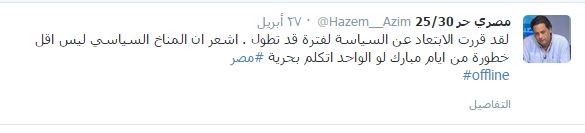 “لقد قررت الابتعاد عن السياسة لفترة قد تطول، أشعر أن المناخ السياسي أشد خطورة من أيام مبارك، لو الواحد اتكلم بحرية”، كلمات شبَّه بها حازم عبد العظيم، مؤخرا نظام الانقلاب الذي ما فتئ يقرض فيه أشعار المديح، بنظام مبارك الذي ثار هو شخصيا عليه كما كان يقول.