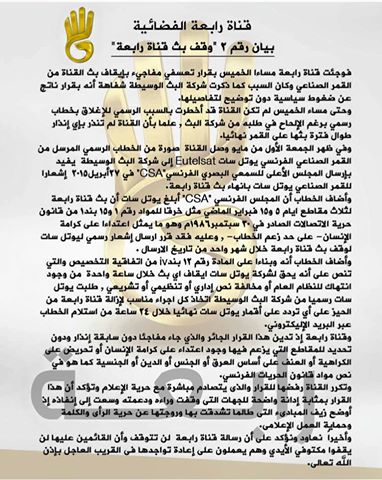 وأضافت “في ظهر الجمعة الأول من مايو وصل القناة صورة من الخطاب الرسمي المرسل من القمر الصناعي الفرنسي يوتل سات Eutelsat إلى شركة البث الوسيطة يفيد بإرسال المجلس الأعلى للسمعي البصري الفرنسي”CSA”  في 27 أبريل 2015، إشعارًا للقمر الصناعي يوتل سات بإنهاء بث قناة رابعة”.