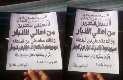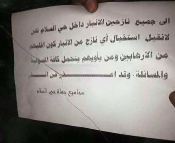 وتناقلت بعض وسائل التواصل الاجتماعي صوراً لمنشورات قيل إنها ألقيت في مناطق ببغداد تضم نازحين من الأنبار وتَضَمّنت تهديدات بالتصفية الجسدية في حال عدم مغادرتهم العاصمة، وحملت تلك المنشورات عبارات طائفية تتهم النازحين بالانتماء لتنظيم “داعش”.
