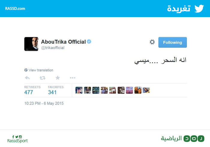 وقال أبو تريكة كلمات لخصت إعجابه بأداء ميسي، إذ قال أبو تريكة عبر حسابه على “تويتر”: “إنه السحر.. ميسي”.