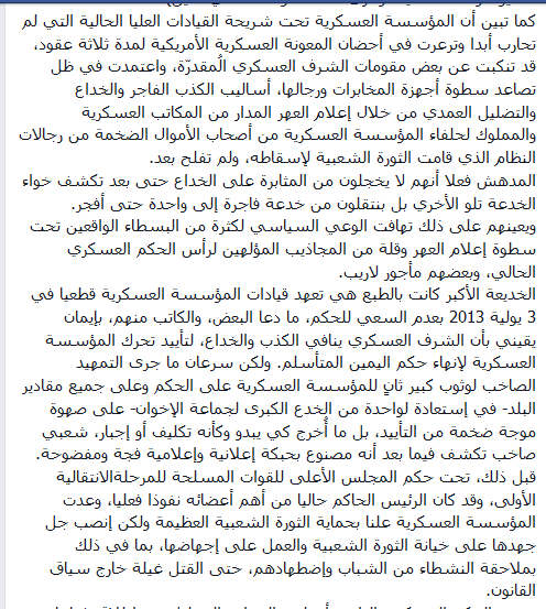 وتابع “كما تبين أن المؤسسة العسكرية تحت شريحة القيادات العليا الحالية، التي لم تحارب أبدا وترعرعت في أحضان المعونة العسكرية الأمريكية لمدة ثلاثة عقود، قد تنكبت عن بعض مقومات الشرف العسكري الُمقدرّة، واعتمدت في ظل تصاعد سطوة أجهزة المخابرات ورجالها، أساليب الكذب الفاجر والخداع والتضليل العمدي من خلال إعلام العهر المدار من المكاتب العسكرية والمملوك لحلفاء المؤسسة العسكرية من أصحاب الأموال الضخمة من رجالات النظام الذي قامت الثورة الشعبية لإسقاطه، ولم تفلح بعد.”