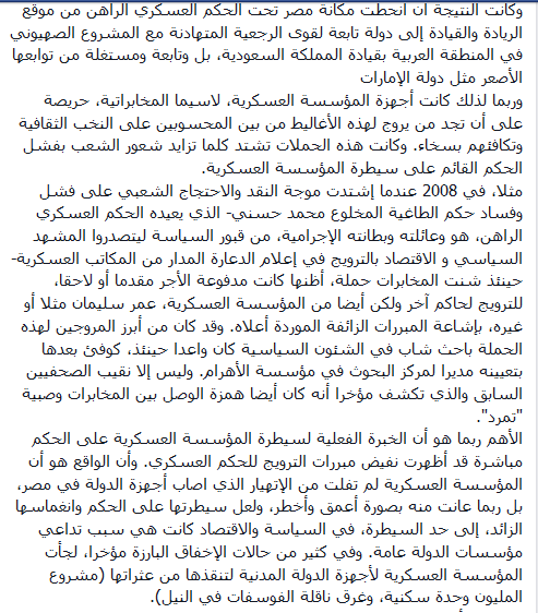 وبين أن الترويج للحكم العسكري في مصر قام على أغاليط مؤداها أن القوات المسلحة هي عنوان الوطنية المصرية، وهي أيضًا المؤسسة الوحيدة من أجهزة الدولة التي مازالت متماسكة، وتتميز باعتماد الأساليب العلمية وبالكفاءة والانضباط، بينما قد انهارت جميع أجهزة الدولة الأخرى تحت وطأة الإهمال والفساد، وأن القوات المسلحة هي “النواة الصلبة للدولة المصرية” وهي “العمود الأخير القائم لخيمة مصر”.