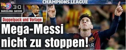 وقالت صحيفة بيلد الألمانيا، أن ميسي الكبير لا يستطيع أحد إيقافه، في إشارة إلى المهارة الخارقة التي مارسها اللاعب في مباراة فريقه أمام البافاري. وأحرز ميسي هدفين في مباراة أمس، قبل أن يصنع الهدف الثالث لزميله نيمار، ليصعب المهمة على الفريق البافاري في جولة الإياب.