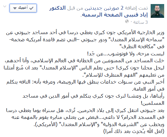وأضاف- عبر منشور له على موقع التواصل الاجتماعي “فيس بوك”- “خلت المساجد من الممنوعين من الخطابة في العالم الإسلامي، وأنا أحدهم، ليحل محلنا جون كيري! حتى يعلم الناس “الإسلام المعتدل” بعد أن مُنع أمثالنا من تعليمهم “الفهم المتطرف للإسلام”.