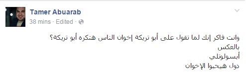 وقال خلال منشور له عبر صفحته الرسمية على موقع التواصل الاجتماعي “فيس بوك”: “وانت فاكر إنك لما تقول على أبو تريكة إخوان الناس هتكره أبو تريكة؟ بالعكس.. أبسولوتلي. .دول هيحبوا الإخوان”.
