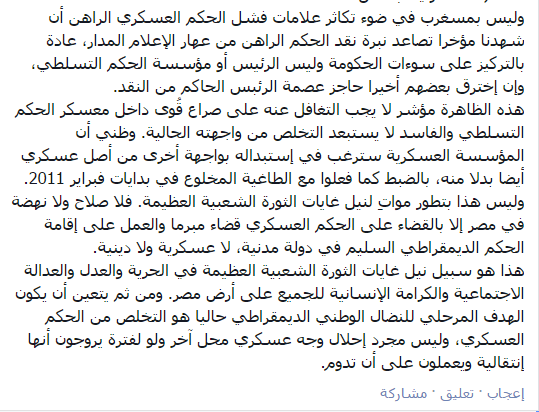 وقال: “ليس بمستغرب في ضوء تكاثر علامات فشل الحكم العسكري الراهن أن شهدنا مؤخرًا تصاعد نبرة نقد الحكم الراهن من عهار الإعلام المدار، عادة بالتركيز على سوءات الحكومة وليس الرئيس أو مؤسسة الحكم التسلطي، وإن اخترق بعضهم أخيرًا حاجز عصمة الرئيس الحاكم من النقد”.