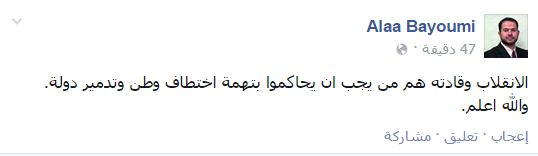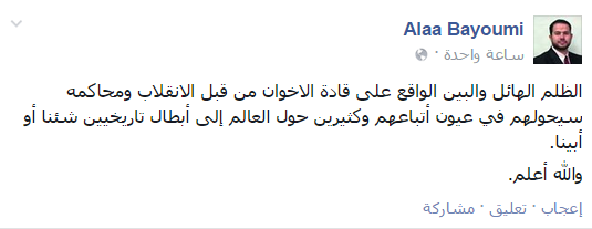 قال الباحث السياسي، علاء بيومي، "الظلم الهائل والبين الواقع على قادة الاخوان من قبل الانقلاب ومحاكمه، سيحولهم في عيون أتباعهم وكثيرين حول العالم إلى أبطال تاريخيين شئنا أو أبينا".