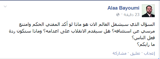 وأشار “بيومي” إلى أن السؤال الذي سيشغل العالم الآن هو ماذا لو أكد المفتي الحكم، وامتنع مرسي عن استئنافه؟ هل سيقدم الانقلاب على إعدامه؟ وماذا ستكون ردة فعل الناس؟”.
