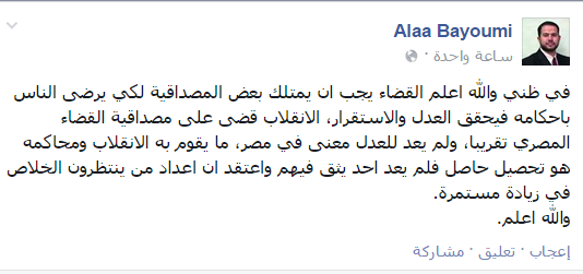 وأعرب -في منشور له عبر موقع “الفيس بوك”-، عن اعتقاده بأن القضاء يجب أن يمتلك بعض المصداقية لكي يرضى الناس بأحكامه فيحقق العدل والاستقرار.