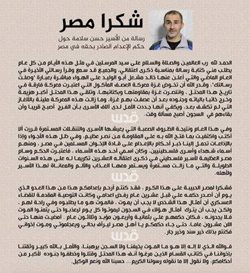 بعث الأسير القسامي “القائد حسن سلامة” من قطاع غزة، المعتقل منذ عام 1996، رسالة من أسره علق فيها على القرار الصادر اليوم، والذي قضى بإحالة أوراقه للمفتي، وعدد من الشهداء الفلسطينيين، بالإضافة لبعض من قيادات الإخوان، بتهمة اقتحام السجون المصرية خلال ثورة يناير.