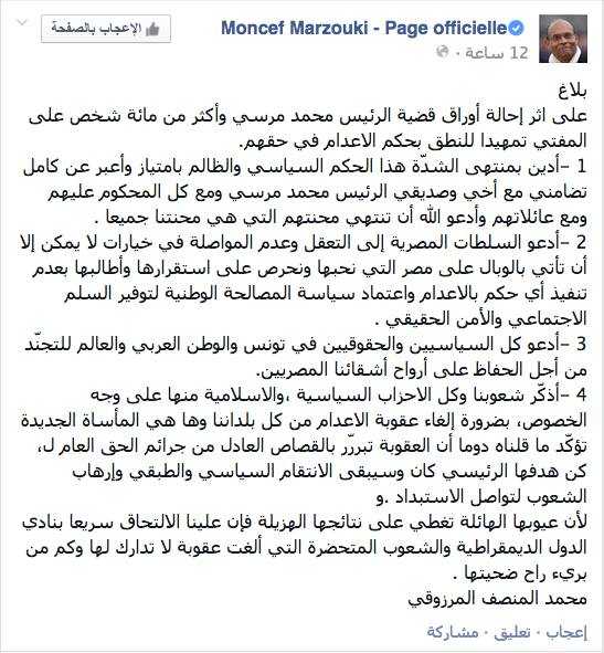 وأعرب المرزوقي خلال منشور له على صفحته الشخصية على موقع التواصل الاجتماعي فيس بوك عن كامل تضامنه مع الرئيس مرسي قائلًا :”أعبر عن كامل تضامني مع أخي وصديقي الرئيس محمد مرسي ومع كل المحكوم عليهم ومع عائلاتهم وأدعو الله أن تنتهي محنتهم التي هي محنتنا جميعا”.