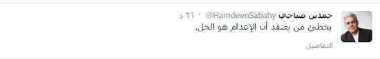 قال حمدين صباحي المرشح الرئاسي السابق عبر منشور له على موقع التدوينات القصيرة "تويتر" يخطئ من يعتقد أن الإعدام هو الحل.