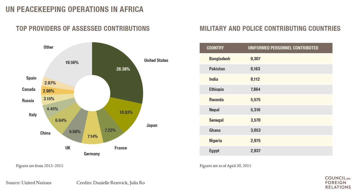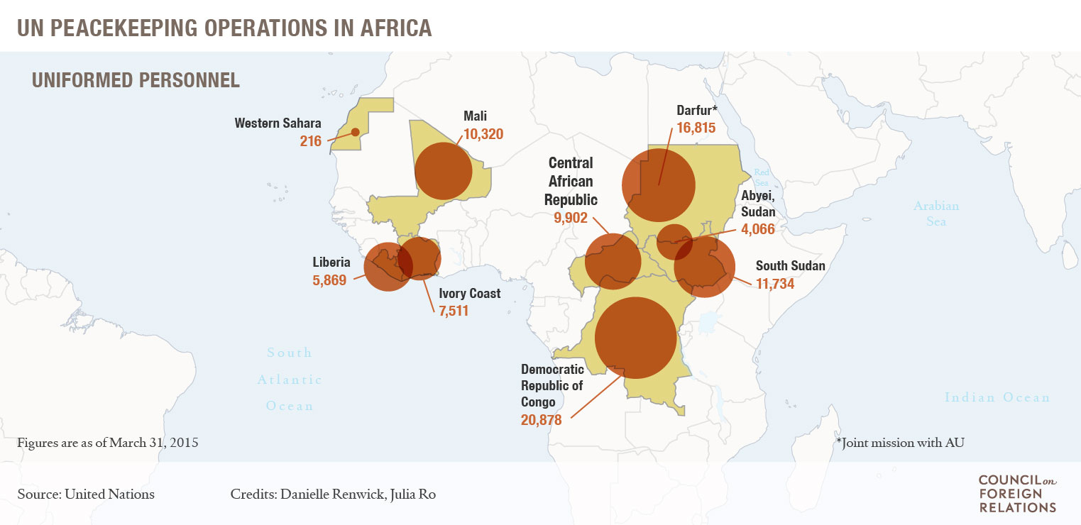 تحت عنوان "عمليات السلام في أفريقيا" نشر مجلس العلاقات الخارجية تقريرًا لـ دانييل رينويك، استهله بالكشف عن ارتفاع عدد قوات حفظ السلام النظامية المنتشرة في إفريقيا إلى أكثر من 100 ألف بحلول عام 2015، أي ضعف ما كانت عليه قبل 10