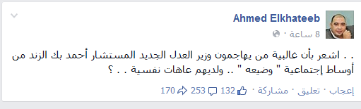 وكتب الخطيب، عبر منشور على موقع “فيس بوك”: “اشعر بأن غالبية من يهاجمون وزير العدل الجديد المستشار أحمد بك الزند من أوساط اجتماعية ” وضيعة” .. ولديهم عاهات نفسية . . ؟”.