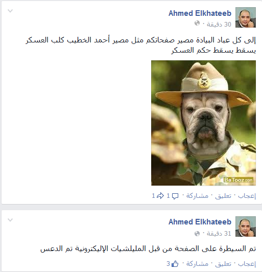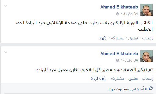 اخترق هاكرز يدعى الكتائب الثورية، صفحة الكاتب الصحفي أحمد الخطيب – نائب رئيس تحرير جريدة المصري اليوم – وذلك بعد ساعات من إطلاقه تصريحات عنصرية بحق الشعب المصري، في منشور على فيس بوك، بعد تعيين المستشار أحمد الزند، وزيرًا للعدل.