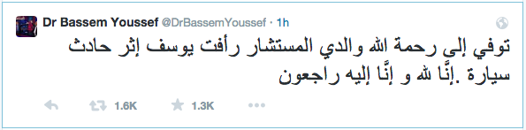 وأعلن باسم يوسف خبر وفاة والده، من خلال منشور ، كتبه على حسابة الشخصي على موقع التدوينات الصغيرة “تويتر”.