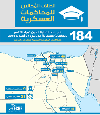 وقال المفوضية، في بيان عبر موقعها الرسمي “بدءًا من 27 أكتوبر 2014 حتى 23 يونيو 2015 وتنفيذًا لقرار عبدالفتاح السيسى بإصدار قانون رقم 136 الخاص بحماية المنشآت العامة والحيوية من قبل القوات المسلحة والذى نص على إعتبار العديد من منشآت الدولة منشآت عسكرية ومنها الجامعات، تم إحالة ما يقرب من 184 طالبًا للنيابة العسكرية بغرض محاكمتهم أمام القضاء العسكرى، طبقًا لرصد المفوضية المصرية للحقوق والحريات.