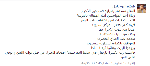 وقال- عبر منشور له على موقع التواصل الاجتماعي “فيس بوك”- “القتل مستمر بضراوة في حق الأحرار، حيث اقتحمت قوات أمن الانقلاب فجر اليوم ،قرية كفر جعفر، مركز بسيون، عددًا من بيوت الأحرار بها”.