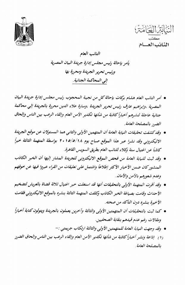 أحال النائب العام، المستشار هشام بركات، نجية المحجوب رئيس مجلس إدارة جريدة البيان المصرية، وإبراهيم عارف رئيس التحرير، وسارة علاء الدين، المحررة بالجريدة، للمحاكمة الجنائية العاجلة، بتهمة نشر أخبار كاذبة من شأنها تكدير الأمن العام.