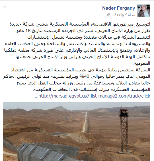 قال نادر فرجاني، أستاذ العلوم السياسية بجامعة القاهرة، إن المؤسسة العسكرية تنشئ شركة جديدة بقرار من وزارة الإنتاج الحربي، لتوسيع امبراطوريتها الاقتصادية.