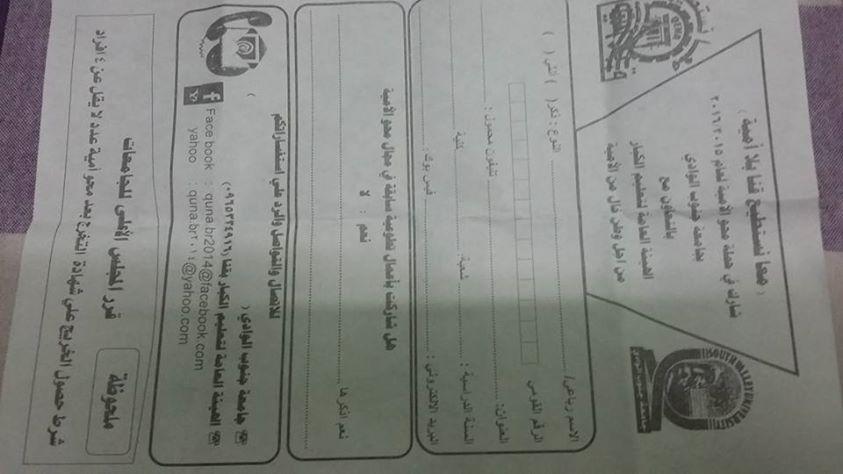 كشفت استمارات توزع على طلاب كليات جامعة جنوب الوادي بقنا، خلال امتحانات نهاية العام، بدءا من اليوم السبت، بوجوب محو أمية أربعة مواطنين.