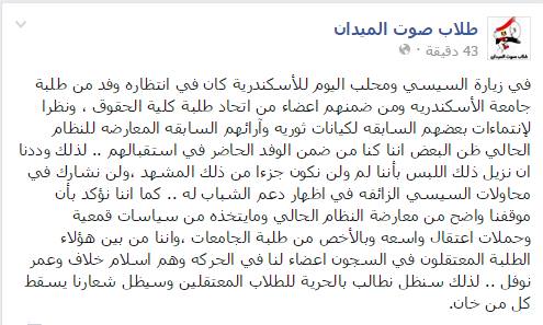 وفى السياق ذاته أصدرت حركة “صوت الميدان” بيان يؤكد انفصالهم عن الأسرة والحركة وأنهم ليسوا أعضاءا بها، وأن الحركة على خلاف مع النظام الحالي، وأن تلك محاولات لتزيف الواقع الطلابي من السيسى ونظامه، وأن الحركة جزء من الحركة الطلابية الرافضة لهذا النظام.