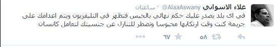 وأكد “الأسوانى”، خلال منشور عبر حسابه على موقع التدوينات القصيرة “تويتر” قائلا، “فى أى بلد يصدر عليك حكم نهائى بالحبس فتظهر فى التليفزيون ويتم إعدامك على جريمة كنت وقت ارتكابها محبوسا وتضطر للتنازل عن جنسيتك لتعامل كإنسان”.