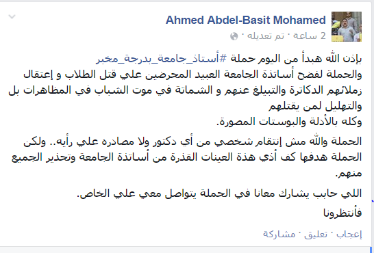 وقال- عبر منشور له على موقع التواصل الاجتماعي “فيس بوك”؛ “حملة لفضح أساتذة الجامعة العبيد، المحرضون على قتل الطلاب وإعتقال زملائهم الدكاترة والتبيلغ عنهم والشماتة في موت الشباب في المظاهرات بل والتهليل لمن يقتلهم، وكله بالأدلة والبوستات المصورة”.
