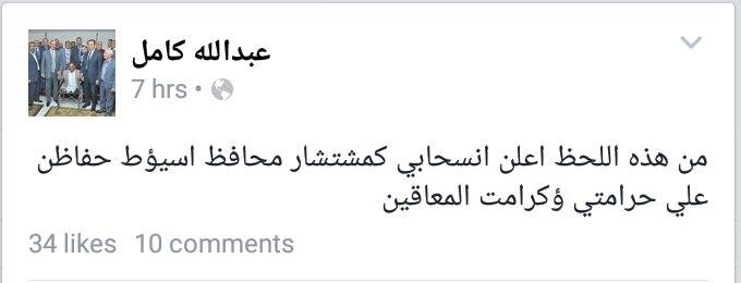 و كتب “كامل”، عبر صفحته على موقع التواصل الاجتماعي “فيس بوك”: “من هذه اللحظة أعلن انسحابي كمستشار محافظ أسيوط حفاظاً على كرامتي وكرامة المعاقين”.