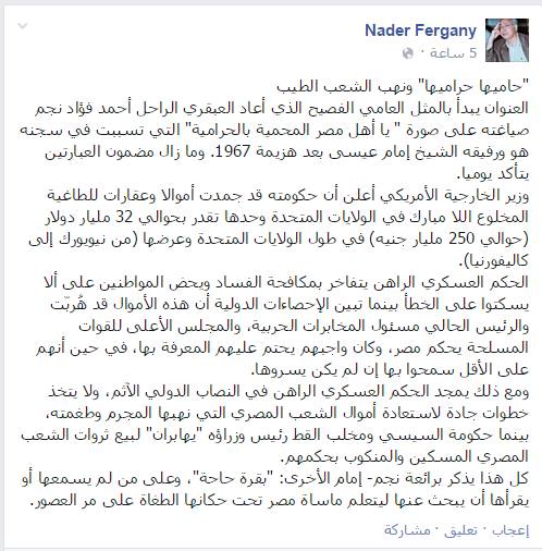 وأضاف- في تدوينته التي أسماها “حاميها حراميها”- “الحكم العسكري الراهن يتفاخر بمكافحة الفساد ويحض المواطنين على ألا يسكتوا على الخطأ، بينما تبين الإحصاءات الدولية أن هذه الأموال قد هُربّت والرئيس الحالي (بحسب وصفه) مسئول المخابرات الحربية، والمجلس الأعلى للقوات المسلحة يحكم مصر، وكان واجبهم يحتم عليهم المعرفة بها، في حين أنهم على الأقل سمحوا بها إن لم يكن يسروها.