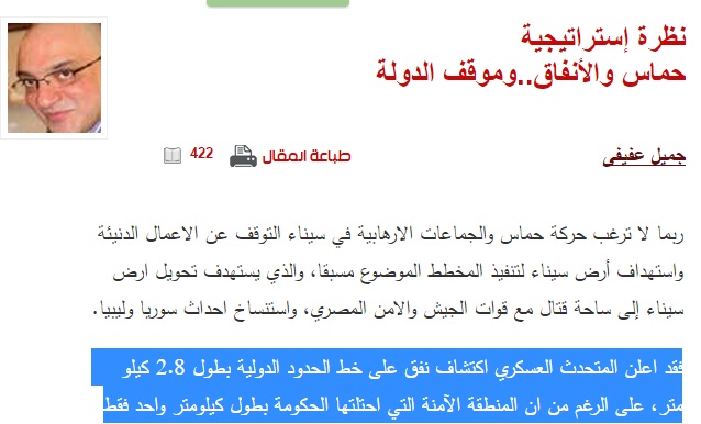 للمرة الثانية على التوالي تقع صحيفة “الأهرام” في خطأ يتعارض مع سياستها التحريرية، إذ نشر الكاتب جميل عفيفي مقالة بصحيفة “الأهرام” حول “الأنفاق”، وصف فيها حكومة إبراهيم محلب بأنها تحتل الشريط الحدودي.