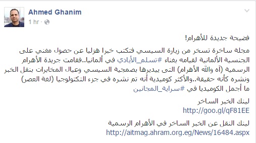 وكتب غانم، في منشور له عبر صفحته على موقع التواصل الاجتماعي “فيس بوك”: “مجلة ساخرة تسخر من زيارة السيسي، فتكتب خبرا هزليا عن حصول مغنٍ على الجنسية الألمانية لقيامه بغناء (تسلم الأيادي) في ألمانيا، فقامت جريدة الأهرام الرسمية (آه والله الأهرام) التي يديرها بصمجية السيسي وعيال المخابرات بنقل الخبر ونشره كأنه حقيقة”.