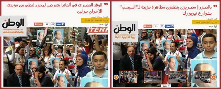 وتداول النشطاء عبر مواقع التواصل الاجتماعي صورتين لكلا الخبر أحدهما منشور في 22 سبتمبر 2014 خلال زيارة السيسي في أمريكا ومرفق بالخبر صورة لعدد من المتظاهرين يرفعون صور السيسي، ثم نشرت الصورة ذاتها اليوم وقالت أنها في ألمانيا لوفد السيسي.