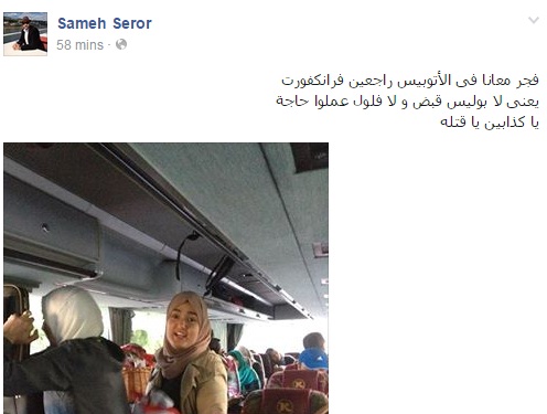 وكتب سامح سرور، أحد أعضاء الوفد المصري المشارك في تظاهرات برلين، منشورا عبر صفحته الرسمية على “فيس بوك” قائلا: “فجر معانا في الأتوبيس راجعين فرانكفورت.. يعني لا بوليس قبض ولا فلول عملوا حاجة.. يا كذابين يا قتلة”.