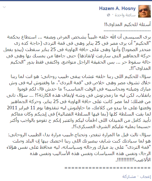 ووجه حسني سؤالا للسيسي- عبر منشور له على “فيس بوك”- قائلا “سؤال للحكيم اللى ربنا خلقه عشان يبقى طبيب روحانى: هو انت لما ربنا خلاك تشوف مصر وهى خلاص فى “قمة التردى”، ما وقفتوش ليه فى وش مبارك وعيلته ومحاسيبه فى الوقت المناسب؟، ما حدش قال لكم قوموا بانقلاب، لكن ليه ما زمجرتوش في وشه لإيقاف هذه الكارثة؟!”.