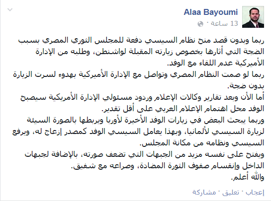 وقال- عبر منشور له على “فيس بوك”- “ربما لو صمت النظام المصري وتواصل مع الإدارة الأميركية، بهدوء لسرت الزيارة بدون ضجة، أما الآن وبعد تقارير وكالات الإعلام وردود مسئولي الإدارة الأمريكية، سيصبح الوفد محل اهتمام الإعلام العربي على أقل تقدير”.