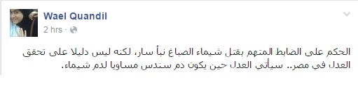 وكتب، في منشور له عبر صفحته الرسمية على موقع “فيس بوك”: “الحكم على الضابط المتهم بقتل شيماء الصباغ نبأ سار، لكنه ليس دليلا على تحقق العدل في مصر.. سيأتي العدل حين يكون دم سندس مساويا لدم شيماء”.