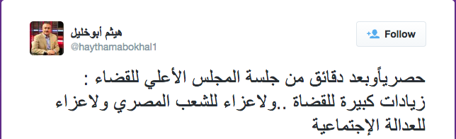 وعلق الناشط الحقوقي هيثم أبو خليل، ومقدم برنامج “حقنا كلنا” على قناة “الشرق” الفضائية، خلال منشور له على موقع التدوينات القصيرة “تويتر” بقوله: “إن مجلس القضاء أقر زيادة كبيرة للقضاة، ولا عزاء للشعب المصري والعدالة الاجتماعية”.