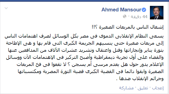 قال الكاتب الصحفي، أحمد منصور، إن النظام لمصري يحاول أن يصرف اهتمامات الشعب لأمور أخرى؛ من أجل أن ينسيهم الجريمة الأساسية وهي الإطاحة بثورة يناير.