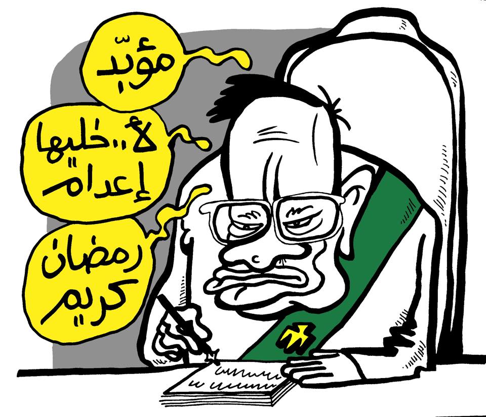 وتضمنت الرسوم صورًا تظهر حال القضاء والشرطة الآن، وصوّرت أحد القضاة وهو يصدر حكم المؤبد ثم يعدله، قائلًا: “خليها إعدام.. رمضان كريم”.