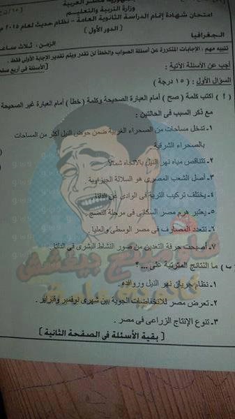 تداول نشطاء على موقع التواصل الاجتماعي “فيس بوك”، نموذج امتحان الجغرافيا لطلاب القسم الأدبي بالثانوية العامة، وذلك بعد مرور ربع ساعة من بدء الامتحان.