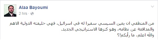 وأضاف بيومي، خلال منشور له عبر صفحته الرسمية على موقع “فيس بوك”، أنه “من المنطقي أن يعين السيسي سفيرًا له في إسرائيل، فهي حليفته الدولية الأهم والمدافعة عن نظامه، وهو كنزها الاستراتيجي الجديد، والله أعلم، ما رأيكم!؟”.
