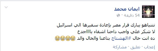 وبسخرية، علقت إيمان محمد: “نتنياهو يبارك قرار مصر بإعادة سفيرها إلى إسرائيل.. لا شكر على واجب داحنا أشقاء يااااجدع ده انت خال ‫و‏الهشتاج بتاعنا والخال والد”.