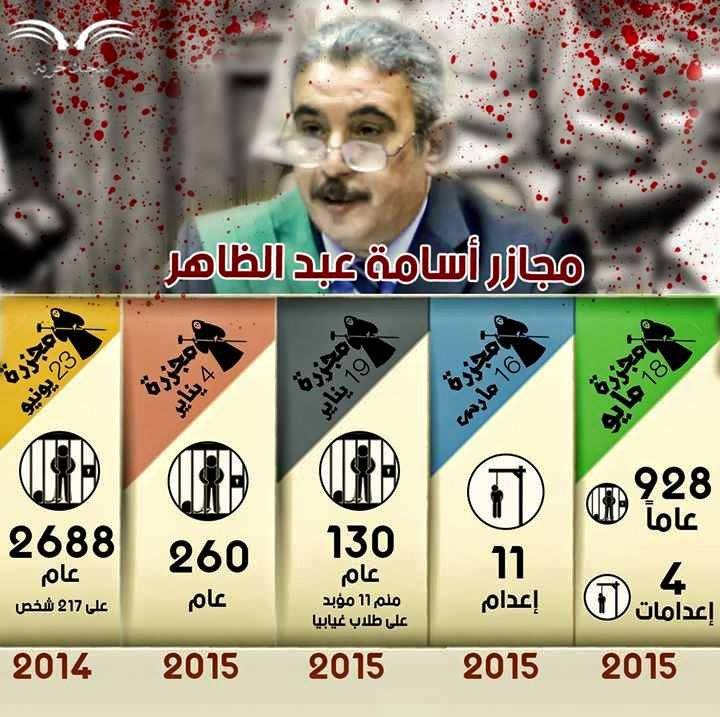 وبحسب الإنفوجرافيك، فقد أصدر القاضي أسامة عبدالظاهر عدة أحكام وصفها النشطاء عبر مواقع التواصل الإجتماعي بالظالمة وبأنها أشبه بـ”المجازر القضائية”، ففي يناير 2015 حُكم فيها علي 23 شخص منهم 9 غيابياً بمجموع أحكام وصل إلي 260 عام في خمس قضايا.