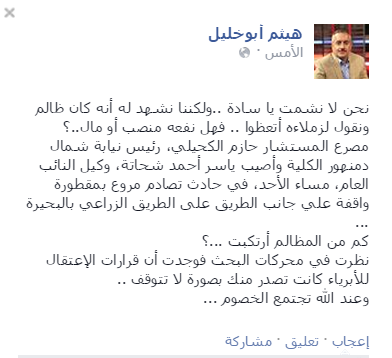وأضاف “يا أحمد يا سعيد، رئيس النيابة اللي رضي إن الداخلية تلبسك قضية تانية غير اللي أخدت فيها إخلاء سبيل اتفصلت راسه عن جسمه النهارده!..يا محمد عبدالرازق، يا سامح يا زلط، يا م الغمري، يا أ. أشرف أبو زيد يا كل الـ200 معتقل -و أكتر- اللي الهالك كان بيجدد لهم بجرة قلم.. الهالك اتفصلت راسه عن جسمه النهادره في حادثة”.