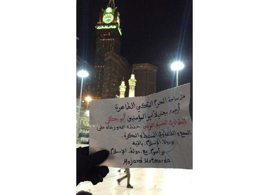 ونشر الحساب صورة أخرى من ساحة الحرم، يظهر فيها برج الساعة المعروف، وبعض مآذن المسجد الحرام، وكتب على ورقة أخرى: “من ساحة الحرم المكي الطاهرة أجدد بيعتي لأمير المؤمنين أبي بكر البغدادي، الحسيني، القرشي، حفظه الله ورعاه على السمع والطاعة، في المنشط، والمكره”.
