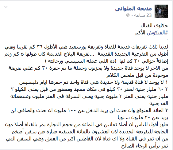 وأكدت الناشطة “من الآخر لا يوجد قناة جديدة ولا يحزنون وجملة ما تم حفره ٣٠ كم على تفريعة موجودة من قبل ملخص الكلام”، مشيرة إلى أن الموجود هو قناة واحدة تم حفرها أيام ديليسبس.