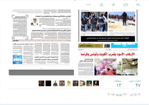 أما جريدة الوسط، فنشرت عنوانًا رئيسيًا قالت فيه “في جمعة الإرهاب.. الدماء تلطخ الكويت وتونس وفرنسا”، وتحدثت الصحيفة باستفاضة عن الهجوم الذي وقع على منتجع سياحي تونسي أدى لمقتل 39 شخصًا، والهجوم على المسجد الكويتي وأيضًا الهجوم على مصنع للغاز في فرنسا.