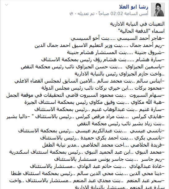 والمعينون هم: “هاجر أحمد السيسي، ابنة شقيق السيسي، ريم أحمد جمال ابنة وزير التعليم الأسبق أحمد جمال الدين، شروق جنينة، ابنة المستشار هشام جنينة، سارة هشام، ابنة هشام رؤوف رئيس بمحكمة الاسئناف، ياسمين الجيزاوي، ابنة حسن الجيزاوي نائب رئيس محكمة النقض، وشقيقة حازم الجيزاوي رئيس بالنيابة الإدارية، وإيناس سالم، ابنة محمد سالم، الأمين السابق لمجلس القضاء الأعلي.